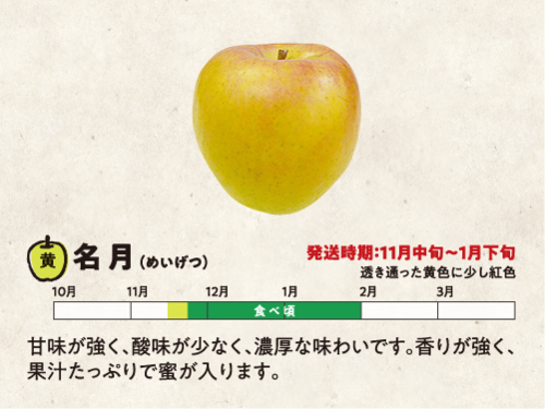 透き通った黄色に少し紅色 甘味が強く、酸味が少なく、濃厚な味わいです。香りが強く、果汁たっぷりで蜜が入ります。