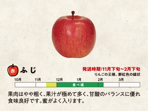 りんごの王様、鮮紅色の縞状 果肉はやや粗く、果汁が極めて多く、甘酸のバランスに優れ食味良好です。蜜がよく入ります。